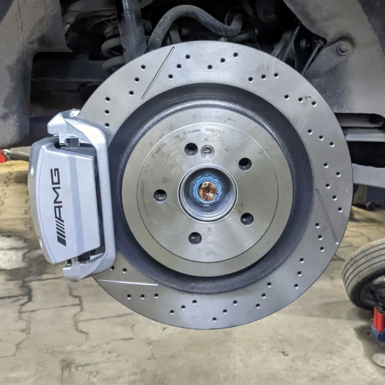 Передняя ось - 6-поршневые суппорты AMG, цельнолитые диски Brembo 360mm.
